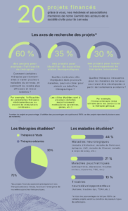 Les projets soutenus dans le cadre de cet appel à projets annuel portent majoritairement sur des thérapies encore à l’étude, illustrant la volonté de la Fondation d’encourager l’émergence de nouvelles approches thérapeutiques prometteuses. Certains projets auront des retombées potentielles sur plusieurs types de pathologies, ce qui explique que la répartition par domaine ne totalise pas 100%, mais plus. Cette transversalité constitue précisément l’un des points forts du programme : faire progresser la recherche en mutualisant les connaissances et l’excellence de la recherche en France pour accélérer l’innovation thérapeutique au bénéfice des patients.