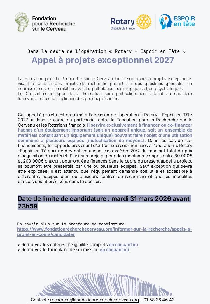 - L’objet du mail sera « Appel à Projets Rotary-Espoir en Tete 2027 – Candidature NOM Prénom ».